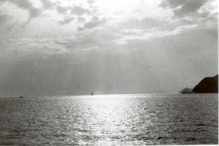 Rays of sun fram behind high clouds shine down on the Ocean and one lone ship on the horizon and a fishing boat off to the left. The album page notes "Almost a Pirate."Collection