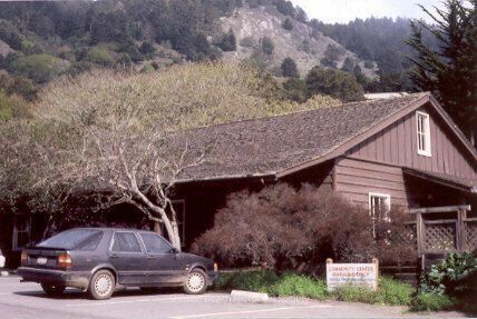 A color print of the community center with a black sedan parked in front. Shows some hills in back.Collection