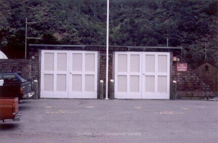 A color photograph of the SB Fire House #2 on Calle Del Arroyo. Two prominent whitish doors at the center, tail ends of a green station wagon and a red truck are seen at left, the green hills vegetation are shown at the back.Collection