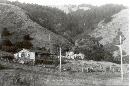Alternate and wider view of Sherfy house (see 1998-224), maybe even a later photo as there seems to be vines growing on the side of the house and two telephone poles are visible leading away from the house. The square front yard of the house is designated by low posts.Collection