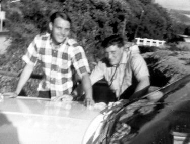 This black and white photo is of two young men standing behind the hood of a car smiling at the camera. They are holding rags and appear to be polishing the car. The boy on the left wearing a plaid shirt is Ken Sherfey. The boy on the right is Don Hoteling. There is shrubbery and a bridge in the background.Collection