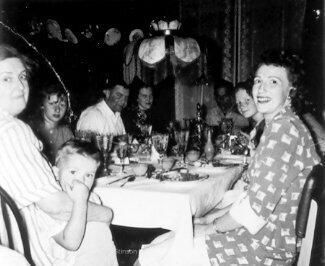 This black and white photo is of eight people sitting around a dining table. The table is laden with plates of food and stem ware. The lady on the left, closest to the camera is looking toward the camera over her right shoulder. She has her right arm around a little boy standing next to her. She is Dorothy Thomsen and the boy is Greg Sherfey. The rest of the people are unidentified. The lady on the right is wearing a print shirt. The rest of the people are farther from the light source and less prominent.Collection