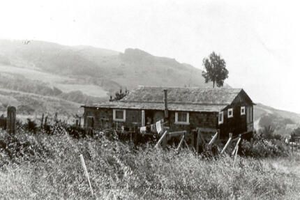 This black and white photo is of a house on a hillside. The house is dark shingle with light trim around the windows. The photo is taken of the badk of the house which is facing out toward the ocean (not distinguishable). There are wild grasses in the forground and hills and emptiness (the ocean) in the background.Collection