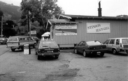 This black and white photograph shows the side of a building. There are three cars parked in a row facing the building and another car parked off the street at the left at an angle facing the front of the building. There are two signs on the side of the building. One says 'Stinson Beach Grill'. The other says 'Fresh Seafood & Pasta & Sandwiches, Barbequed Fresh Local Oysters, Outdoor Dining - Fully Heated Deck.'Collection