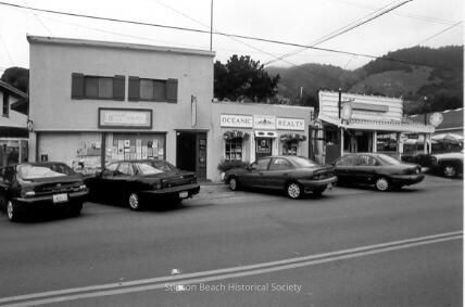 This black and white photograph is of three store fronts lining Highway 1 in downtown Stinson Beach. The front on the left has large glass windows with what appear to be posters on them. It has a sign above the windows which is illegible in this photo. It is the old Stinson Beach Library. Next to it on the right is a lower, smaller building with a window on each side of a door, taking up the entire building front. There is a large sign above the windows and door saying Oceanic Realty. To the right of this building is another small building with an overhang jutting out, creating a covered front porch across the width of the building. There is a sign above the overhang, illegible in this picture. It is the Sand Dollar Restaurant. There are cars in front of these buildings parked at right angles to the highway.Collection