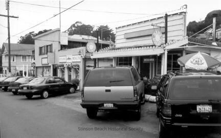 This is a black and white photograph of the buildings described is #1998-244-01 taken from right of the Sand Dollar looking back down the street at the Sand Dollar, Oceanic Realty, the library and beyond to a two story building not shown in #1998-244-01. The parked cars partially obscure the street level of the buildings.Collection