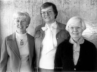 Three women facing the camera are: Doris Lindfors (L) in a blazer and turtleneck sweater with medallion; Ethel Aldridge (R) in black cardigan and textured blouse; and an unidentified woman standing between them in a suit with tie collor blouse.Collection