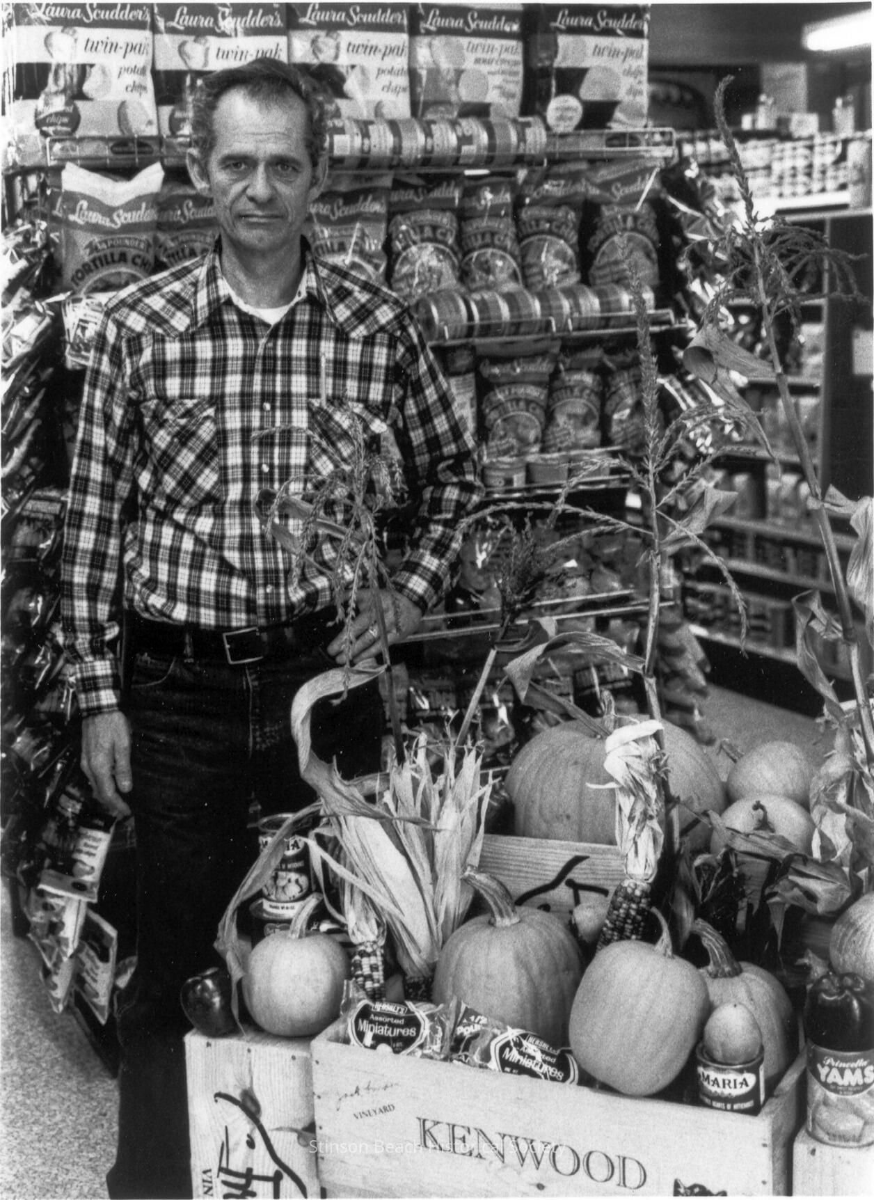 Ed McGillicuddy, owner of Ed's Superette, stands beside his Halloween display of pumpkins and candy.Collection