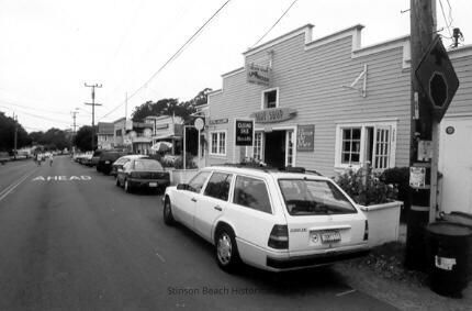 This black and white photograph is taken looking down a street (highway 1) with buildings on the right. The building closest to the camera has an expansive front of board siding. The roof line (a false front) rises in steps on each side. There is white trim on the roofline and around the windows and the door which is located between the windows. There is a surf board against the building above the door on which is written 'Surf Shop'. There is another sign, attached at right angles to the building, above the surf board sign and a small upper window, close to the top of the roof. Cars are parked along the road in front of the buildings, the one closest to the camera being a white station wagon.Collection