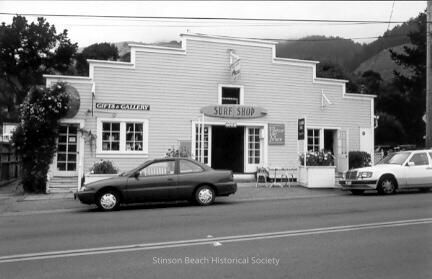 This black and white photograph is of the same building described in photo 1998-248-01 but it is taken from across the road and shows the front of the building more clearly. Besides the wide front door in the center of the building it shows a small door at the left side of the building. There is a sign over the left hand window saying 'GIFTS GALLERY' There are planter boxes of flowers and two cars, a dark one on the left and a light one on the right, parked in front of the building.Collection