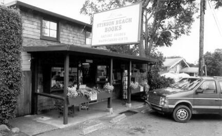 This black and white photo shows a shingled building with an overhang running along the front. The overhang is supported by posts and the posts support a planter box on each side of the entry. There are two windows in the upper story above the overhang and a sign at right angles to the front of the building, also above the overhang, reading 'Stinson Beach Books Nature Guides Maps-cards-gifts'. The front of a car is visible at the right of the picture, parked with its nose pointed toward the store.Collection