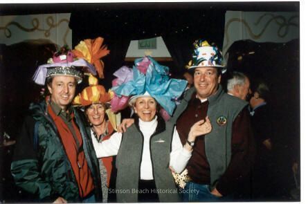 A colored photograph of 4 millennium party gores with their colorful party hats. 2 men and 2 women. The hats are decorated on top of regular hats with colored papers. The people are unknown.Collection