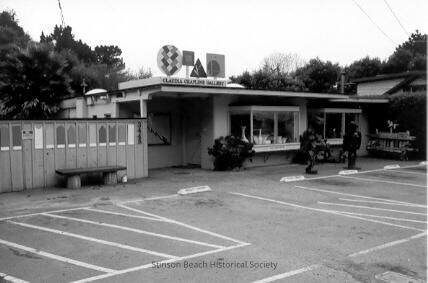 This black and white photo is of a low building with a fence to the left and a parking lot in front. The building has a flat roof with four artistic painted panels of varying shapes (square, triangular and oval) mounted on sticks like popsicles. Underneath the panels along the edging of the roof is a sign reading CLAUDIA CHAPLINE GALLERY. The buliding has an entry on the left and two bay windows along the side to the right of the entry. The left hand bay window displays what appears to be ceramic items. There are four sculptures in front of the building, two of which appear to be standing human or animal figures. To the left of the building is a solid board fence with a colored, shaped panel on the top third of each board. There is a parking area in front of the building with painted lines designating parking spaces.Collection