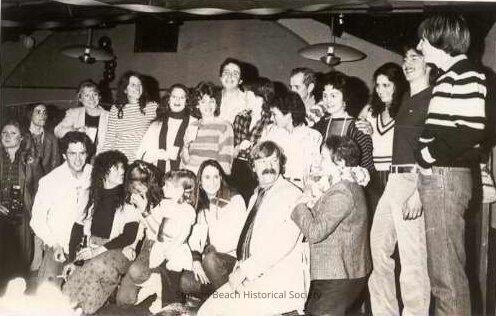 B&W group photo at Ed McGillicuddy's "retirement" party at the Community Center. Most of the folks were employed at Ed's Superette at some time or other. Those standing in the rear are (L to R) Cece Fischer, (the next 4 females are unidentified), Julie Stevens, Alex Horvath, 2 unidentified younger girls, a barely visible Ed, Flo Vierra, unidentified female, Jay Kinberger and Matt Lewis. Kneeling in front (L to R) unidentified male, Robin Ahlgren, unidentified woman hiding face and child, Suki, Charlie Lenhoff and Bev McGillicuddy,Collection