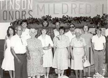 Group photo in front of the fireplace at the Community on the occasion of Stinson honoring Mildred and Lester Sadler, who are standing in the front row on the left. The rest of the group, from young to old, are their extended family.Collection