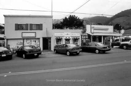 This black and white photo is of the same two buildings described in the previous number (1998-254-01) but the camera is farther back and includes the building to the right. This building (The Sand Dollar) has a false front rising above a deep overhang sheltering the entry. There is a sign running the length of the false front (illegible in this photo) and two circular signs hanging at right angles to the building from poles arising from the outer corners of the overhang. (See also 1998-244-01 and 251-01).Collection