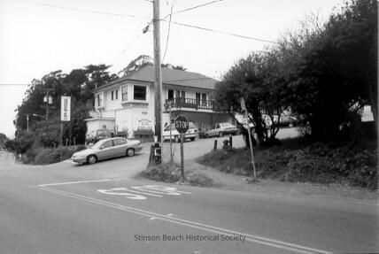 This black and white photograph is very similar to the previous one (#1998-259-01) except the camera is a bit farther away and a car is stopped at the stop sign on the street in front of the building.Collection