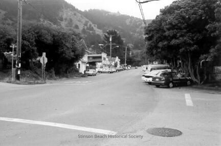 In this black and white photograph the camera is located at an intersection, looking down the road with the cross street going left to right in the foreground. There are buildings stretched out along the left side of the street, with cars parked in front of them. There are trees on the left and right side of the street at the corner and cars parked in front of the trees on the right side. Hills are visible on the left side behind the buildings. The road is Highway One. The cross street is Calle del Mar.Collection