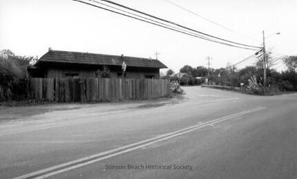 This black and white photo looks across Highway 1 at a one-story building (formerly Elwood's restaurant) with a six foot grapestake fence around it. The fence obscures all but the roof and the upper portion of the windows of the house. There is a road branching off to the right of the building from the highway. The highway is Highway 1 and the branching road is Calle del Arroyo. There are telephone lines stretching from a pole located across from the building, at the corner of Highway 1 and Calle del Arroyo. (See notes).Collection