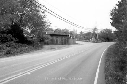 This black and white photograph is of the same building described in 1998-265-01 but the camera is backed away down the road. There is a wide sweep of highway going from the left and mid fore ground to the right middle ground with the house and fence located across the road at the center of the picture. There are trees on both sides of the road and telephone wires stretching from a pole beyond the house on the left side of the road to out of the picture in the left upper corner.Collection