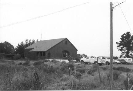 A barnlike building with a peaked roof is at the center of the black and white photograph. There are trucks and cars parked in front of the building on the right side of the photo and dry grasses and low shrubs in the foreground. There is a telephone pole at the right of the picture. The building is the headquarters of the Stinson Beach Water District. (See Notes)Collection