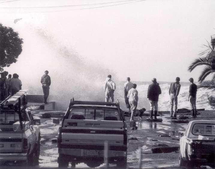 In this black and white photo ten people are visible standing at the end of a street watching the giant waves breaking. Three parked trucks are in the foreground, behind the men. The street is Calle del Sierra.Collection
