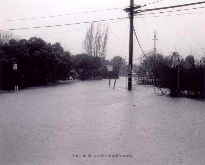 This black and white photo is of a flooded street. There are shrubs and trees on either side standing in the water as well as street signs and a telephone pole. The street is Calle del Arroyo and the flooding is the result of the rising of Easkoot Creek. (See notes)Collection