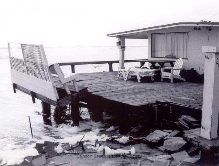 The B&W photo shows part of the deck, bench and screen attached to the beachfront house known as the "Castle House" being torn away by the incoming tide. Rubble and sea-foam covered household debris are littered beneath the deck.Collection