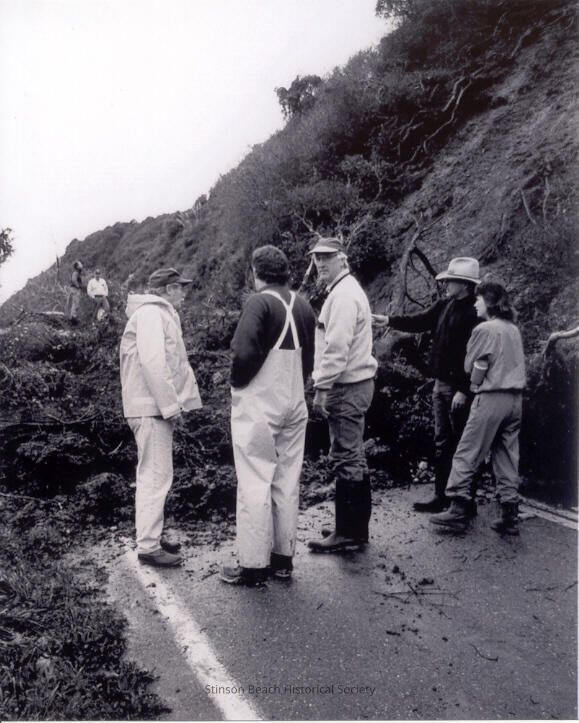 Mudslide onto Highway 1 just north of the Water District office is being inspected by (L. to R.) Kendrick Rand, Ken Stevens, MacAdam Black (looking at camera), and Lloyd and Kim Potts.Collection