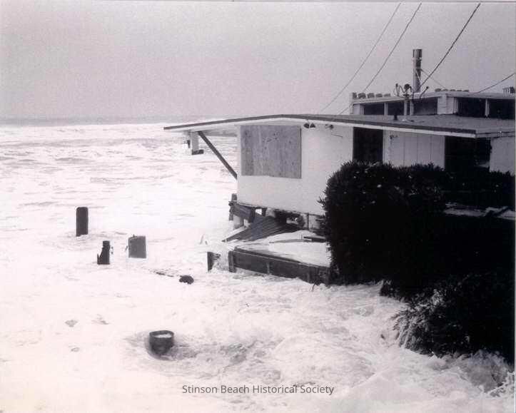 The Castle house is being inundated with water as the incoming tide rushes around it. The deck is being destroyed. The tops of several pilings are visible above the water.Collection
