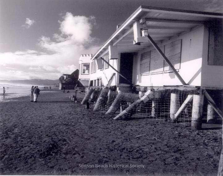 The Castle House the day after the storm without a deck. Mesh screening surrounds the base of the house which is sitting on pilings several feet above the sand. It is a clear day with some clouds in the sky. Three people on the beach consider the damage.Collection