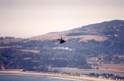 This color photograph is an aerial view looking across the shoreline of a sand spit with a lagoon on the other side and the land behind rising up to a wooded hill. There is a helicopter at the center of the photo, silhouetted against the hillside. There is a line of houses stretching the length of the sand spit and a few buildings on the other side of the lagoon and part way up the mountain. The sand spit is Seadrift, the water on the ocean side is Bolinas Bay and the lagoon is Bolinas Lagoon.Collection