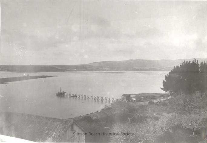 View from the hill down onto McKinnon's Landing, a marshy area along the Bolinas Lagoon, with the Bolinas Mesa and hills in the distance. A barn roof on the hill is partially visible in the lower left of the photo while down below another small building in a similar style is almost visible. Beyond, along the water's edge, a white horse (maybe a brown one too) stands beside a small shed-like building from which a trestled boat landing pier extends into the water. The land area above is mostly scrubby tree branches. A narrow road heading north can be seen through the branches.Collection