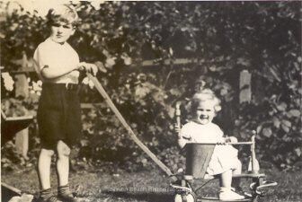 Fred (5 years) in knickers and white shirt pushes a smiling Barbara (1-1/2 years) in a wooden stroller/tricycle in leafy Mill ValleyCollection