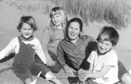 This black and white photograph is of a woman and three children. They are reclining on a sand dune with sea grass behind them. They are all smiling at the camera. The woman is Barbara Scott. To her right and behind her are two of her daughters; Nancy, to her right and Trisha (Patricia) behind her. Her other daughter Becky is in front of her.Collection