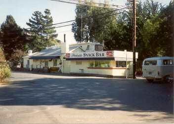 View looking up Arenal of the Parkside Snack Bar (foreground) and Cafe. There are no people. A VW camper is partially visible parked in the shade on the right. On the back of the original, written in ink is "The Place to Be in Stinson Beach, a Great Team, & Jazz & Your Italian look! OK, Dave?"Collection