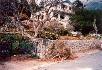 Three story stucco house with blue trim (known as Casa del Mar) sits on a rise above a rock and native plant garden, and is enclosed by a low rock wall. A iron gate on the left gives entrance beside a barren tree, which may have just been trimmed as there are branches lying on the ground outside the wall by the gate. The golden, orange and red colors of the plants imply that it is winter.Collection