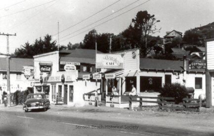 View of downtown buildings along Highway One. From R. to L. is The Breakers Cafe with an open deck. Two people are sitting on the railing looking toward the camera. A sign on the roof towards the rear says Cottage. Next is a white building with a Coca Cola sign out front and signs on the side saying Fountain - Lunch and Ice Cream. A black automobile is parked diagonally in front of it. The next building is only partially visible and remains the same in look today.Collection