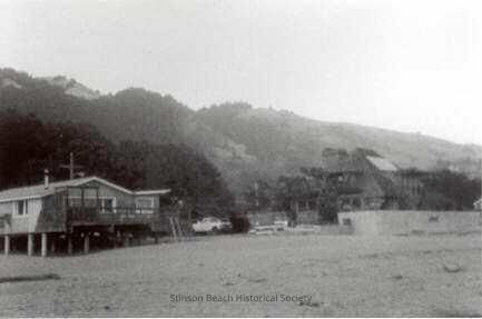 View from the beach, facing south, of the two houses at the end of Calle del Sierra. The larger 2-story A-frame house (John Marsh Davis, architect) sits behind a cement seawall. It was owned for many years by the Robert Evans family. A white truck is parked between this house and the other one-story sitting on pilings. This was part of the Upton house.Collection