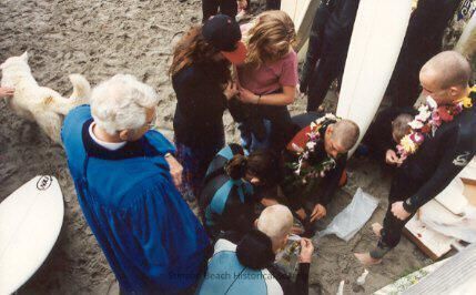 This color photograph (taken from above) shows two men and a woman crouched on the sand at the commencement of a surfer's funeral. They are in wet suits and are preparing little bags of ashes of the deceased to be scattered in the ocean by the participating surfers . Standing around the three and watching are two women in a semi-embrace, another young man in a wet suit, and a white-haired minister in blue robes. The three young men all have shaved heads in honor of the deceased, and two have leis around their necks. See notes.Collection