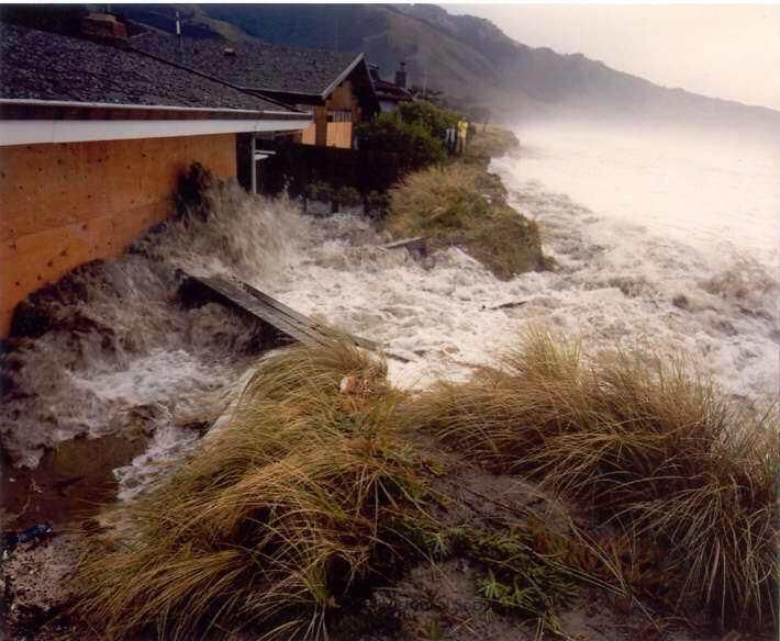 Waves crash againt the exterior of the George Hartman house (314 Seadrift Road) and over the dune grasses. The waves are foamy white and carry boards/fencing up against the house. All along the Seadrift beachfront waves eat away at the dunes. Two people stand at the edge of what remains of the dunes looking at the wild water.Collection