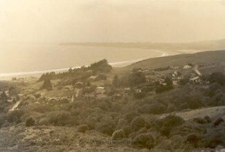 Vintage sepia-toned photo of panoramic view of Stinson Beach/Bolinas Bay from the scrubby hillside. Only a scattering of houses dot the hillside and most are separate from each other or surrounded by treesCollection