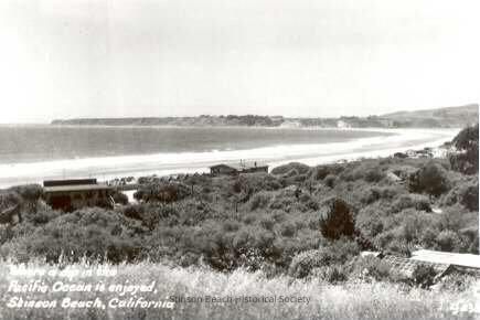 Panorama of Bolinas Bay from the downtown when it was filled with trees and not houses. Onlly a few buildings can be seen near the beach. On the front of the photo, bottom left, is written in white "Where a dip in the Pacific Ocean is enjoyed, Stinson Beach, California."Collection