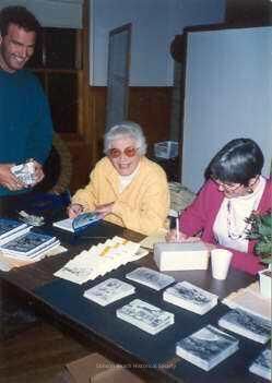 This color photograph shows two women sitting at a table and a man standing beside them. The unidentified man (Xavier ?) on the left is smiling. He is wearing a blue sweater and is holding a book or some postcards. Next to him a lady (Joan Reutinger) with white hair and dark glasses and wearing a yellow jacket is smiling at the camera while signing her book. Next to her a lady (Jane Slack) in a pink sweater is also writing something. There are piles of books in front of Joan and stacks of postcards on the rest of the table. see notes.Collection