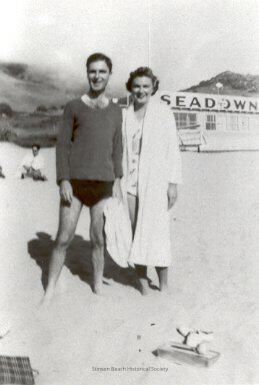 The couple, facing the camera, standing on the beach in front of Sea Downs are Dr. Harold A. Harper and Mrs. Ralph Harring. Harold is brother to Edward and son of Regina and Gus. Harold is in black swim trunks and scoop neck shirts. She is in a 2-piece bathing suit which is covered by a long white robe.Collection