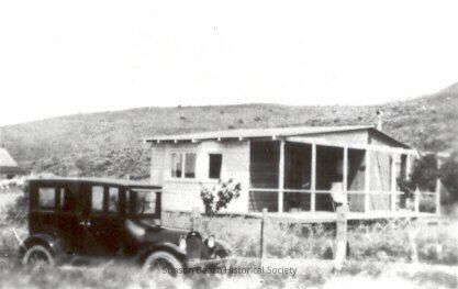 A one-room cabin sits at the base of a hill with a black Model T parked in front and separated from the house by a wooden fence. Two windows on the left side, an open deck spanning the other side, which may be screened. This is identified as the Harper House aka Pioneer House at 235 Buena Vista.Collection