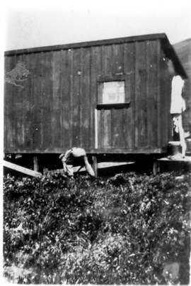 This black and white photograph depicts part of a boxy one story building sitting on a raised, open foundation. The building has one fixed window and vertical wood siding. There is a man with his backside to the camera leaning over and doing something at or by the foundation. See notes.Collection