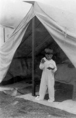 In this black and white photo a little boy in pajamas with feet stands in the opening of a tent. He is holding something in his left hand and looking down at it. See notes.Collection