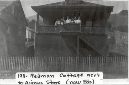Two-story wooden house (the Redman Cottage next to the Airey's store) with outside stairs leading up to a second-floor mini porch that extends out from the main porch that runs the length of the house and where members and friends of the Harper family have gathered. Picket fence extends across the front of the house.Collection