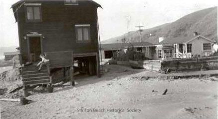 Two-story wooden house on the beach at end of Calle del Pinos (#24) circa 1939. There are wooden stairs on the left going up to a door. A person is sitting on the top of the stairs. To the right of the house is another one-story white house (#20) with a flat wood fence surrounding it.Collection